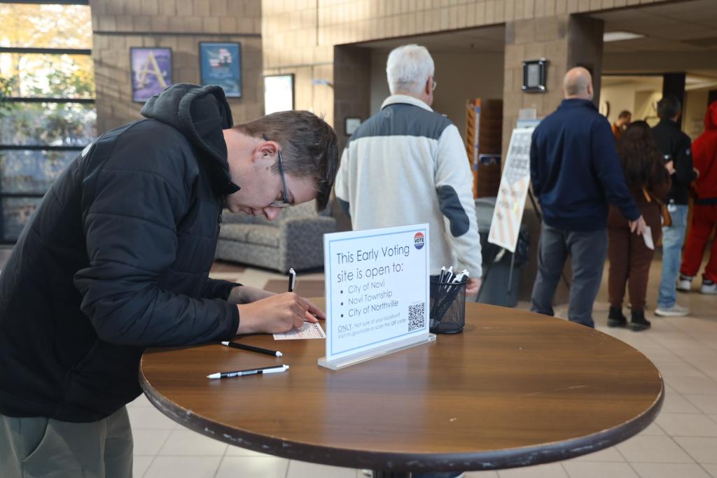 10月28日,在美國密歇根州奧克蘭縣諾維,一名男子在投票站填寫資料準備參加提前投票。新華社記者 徐劍梅 攝