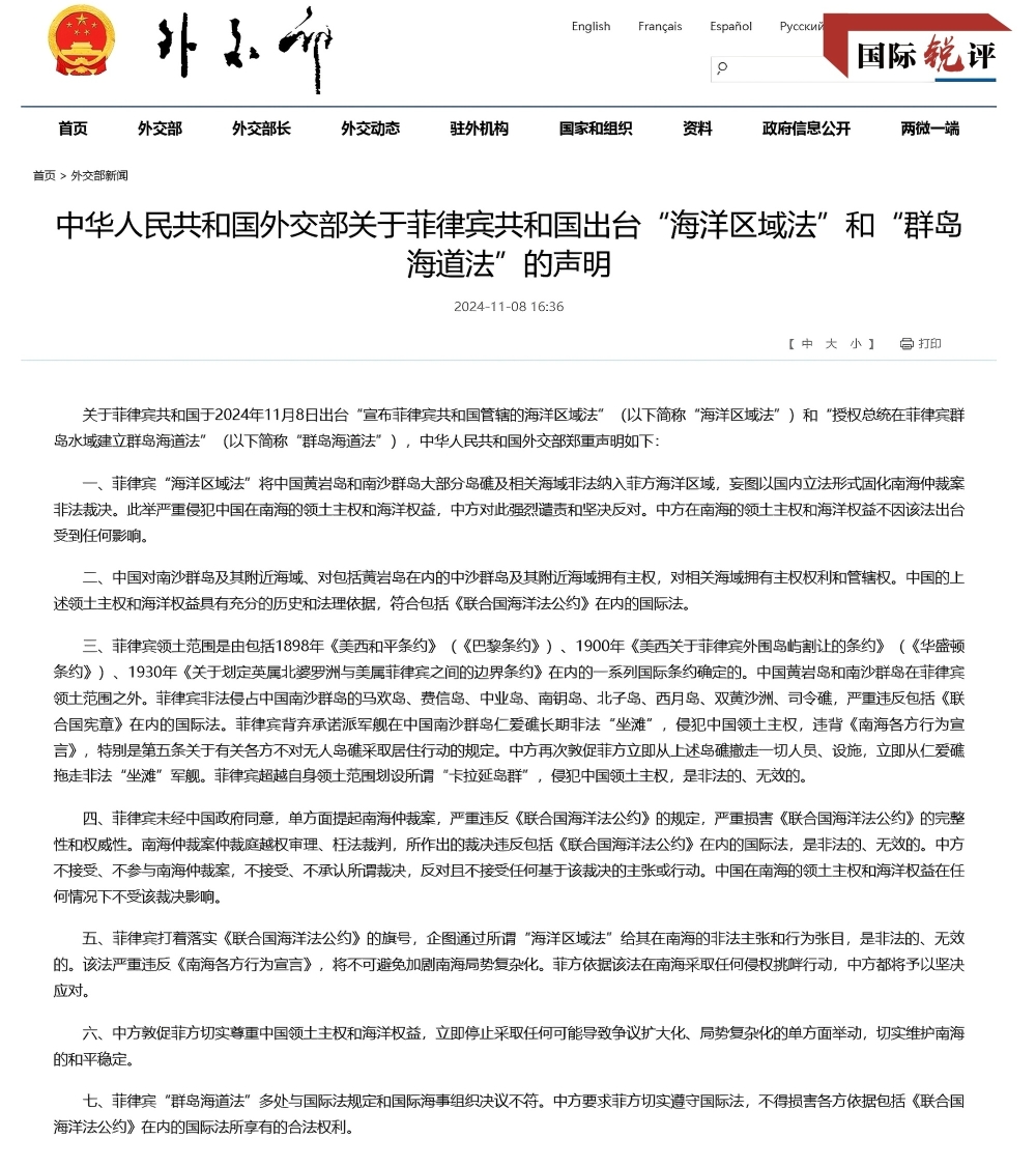 南海本應(yīng)是和平、友誼與合作之海。然而,菲律賓所作所為違背了地區(qū)人民這一共同心愿,已經(jīng)成為地區(qū)和平穩(wěn)定的主要破壞者。正告菲方立即停止侵犯中國(guó)領(lǐng)土主權(quán)和海洋權(quán)益的非法行徑,立即停止任何可能導(dǎo)致南海爭(zhēng)議擴(kuò)大化、局勢(shì)復(fù)雜化的單方面舉動(dòng)。倘若菲方依據(jù)“惡法”在南海進(jìn)一步侵權(quán)挑釁,中方必將堅(jiān)決應(yīng)對(duì),說(shuō)到做到。