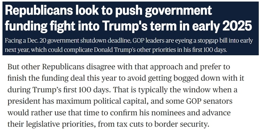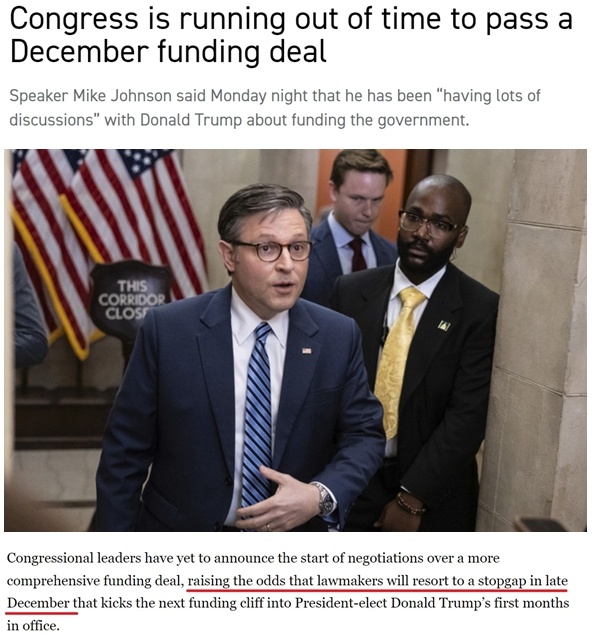 據(jù)報(bào)道,不少共和黨議員、特別是負(fù)責(zé)撥款的議員希望在年底前完成新財(cái)年的總預(yù)算支出談判,避免給特朗普的新政府明年上任后制定政策時(shí)帶來額外干擾,因?yàn)檫@些政策將“決定他們控制國會(huì)和白宮的頭100天”。