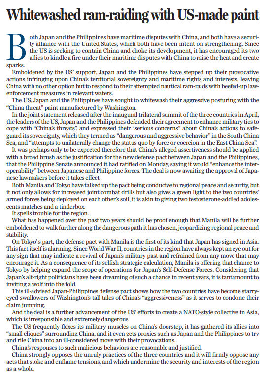 菲律賓和日本都大肆宣揚該協(xié)定有利于地區(qū)和平與安全,但實際上,該協(xié)定不僅允許兩國間增加聯(lián)合作戰(zhàn)演習,還為兩國在對方領土上部署軍隊開了綠燈,這無異于將火柴和火藥桶交到兩個荷爾蒙過剩的青少年手中。