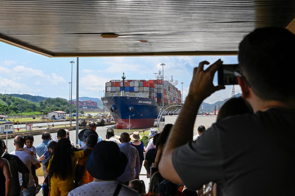 8月28日,在巴拿馬首都巴拿馬城附近,游客在巴拿馬運(yùn)河的米拉弗洛雷斯船閘游客中心觀看貨輪通過船閘駛?cè)胩窖蟆P氯A社記者李木子攝