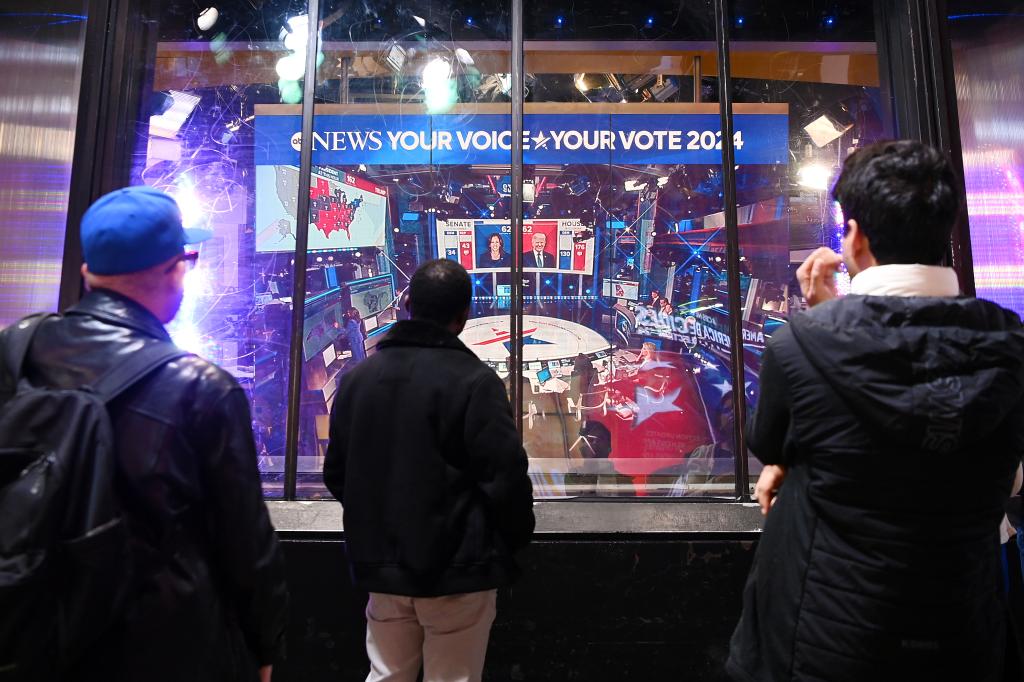 2024年11月5日,人們在美國紐約時報廣場觀看美國總統(tǒng)選舉實(shí)時出口民調(diào)。新華社記者 李睿 攝