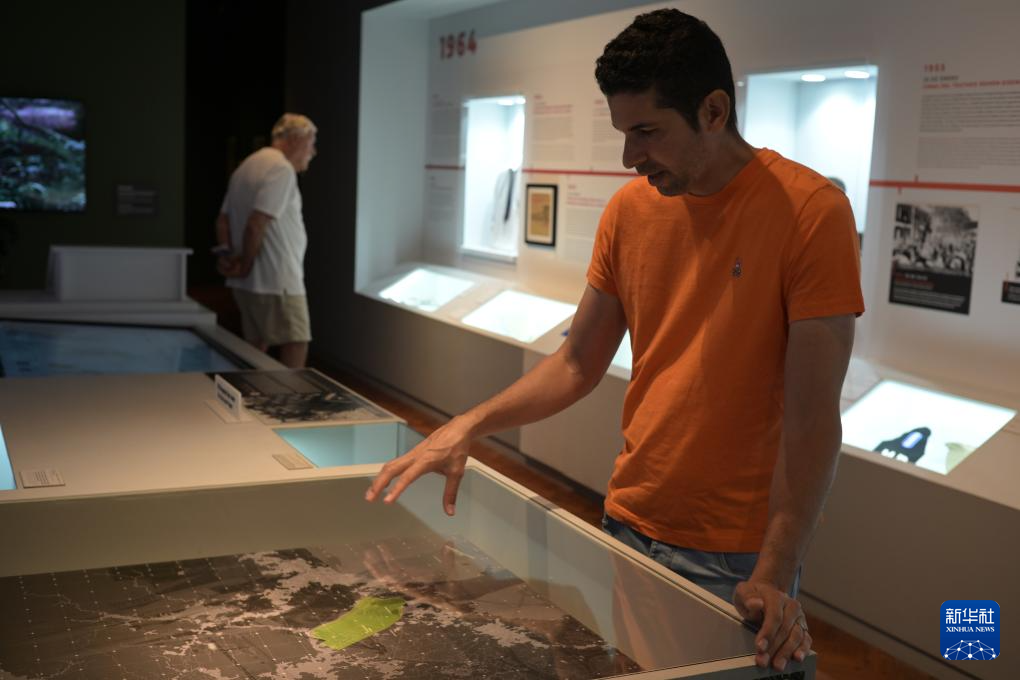 12月18日,在巴拿馬首都巴拿馬城,巴拿馬攝影師阿爾弗雷多·馬蒂斯在巴拿馬運河博物館“未爆的炸彈”展覽上進行講解。新華社記者 陳昊佺 攝