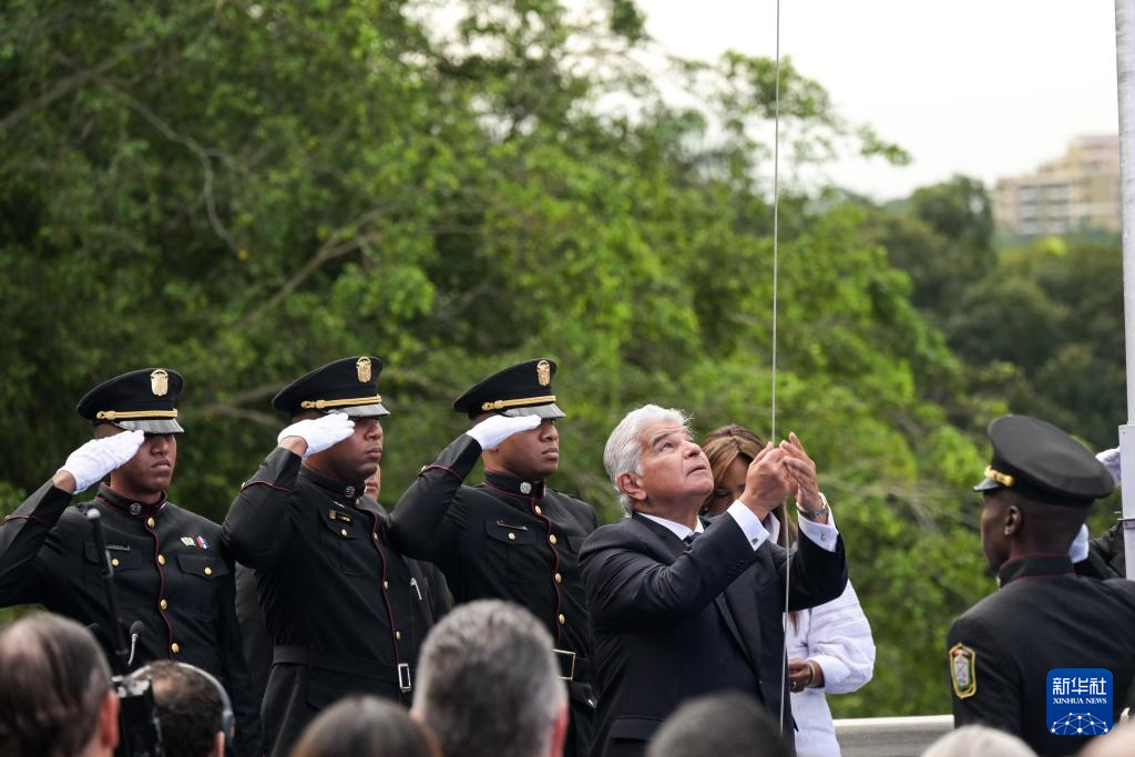 12月31日,巴拿馬總統(tǒng)穆利諾(中)在首都巴拿馬城舉行的正式收回巴拿馬運(yùn)河主權(quán)25周年紀(jì)念活動(dòng)上升起國旗。新華社記者 陳昊佺 攝