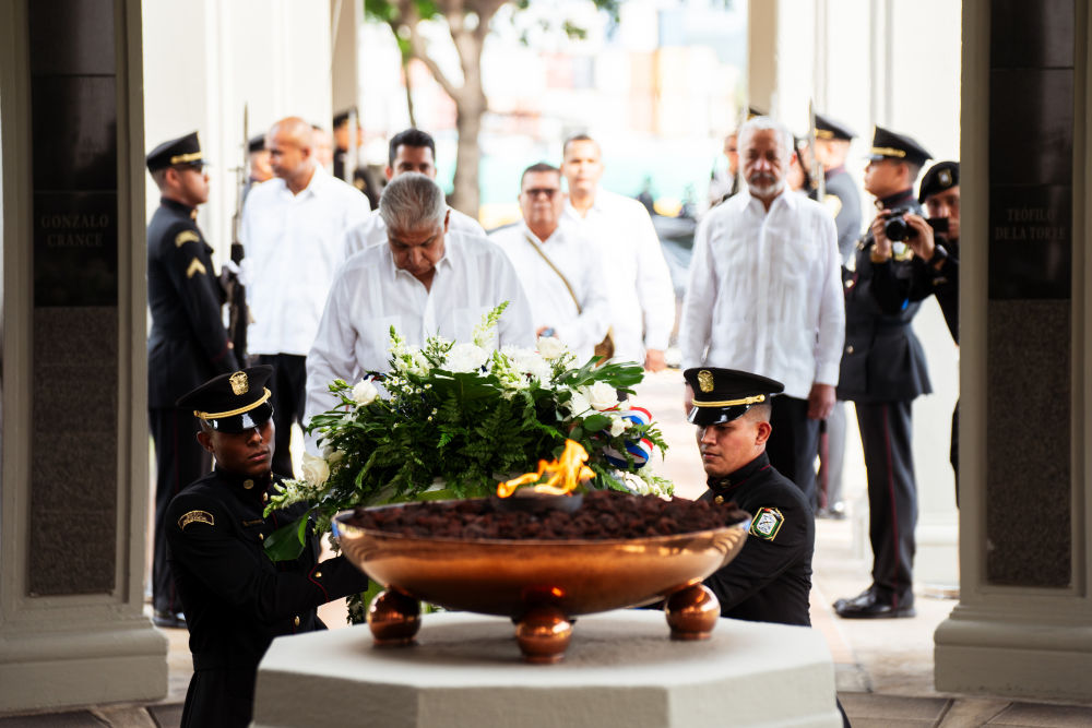 1月9日,在巴拿馬首都巴拿馬城,巴拿馬總統(tǒng)穆利諾(前中)向紀念1964年“護旗運動”的“永恒之火”紀念碑獻花圈。新華社記者許詠政攝