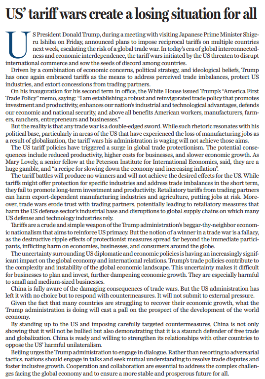 上周五,美國總統(tǒng)特朗普在會見到訪的日本首相石破茂時宣布,下周將向多個國家征收“對等關(guān)稅”。由此,全球貿(mào)易戰(zhàn)風(fēng)險升級。當(dāng)今,世界互聯(lián)互通,經(jīng)濟相互依存,美國發(fā)起的關(guān)稅戰(zhàn)或?qū)_亂國際貿(mào)易,使得各國心生間隙。