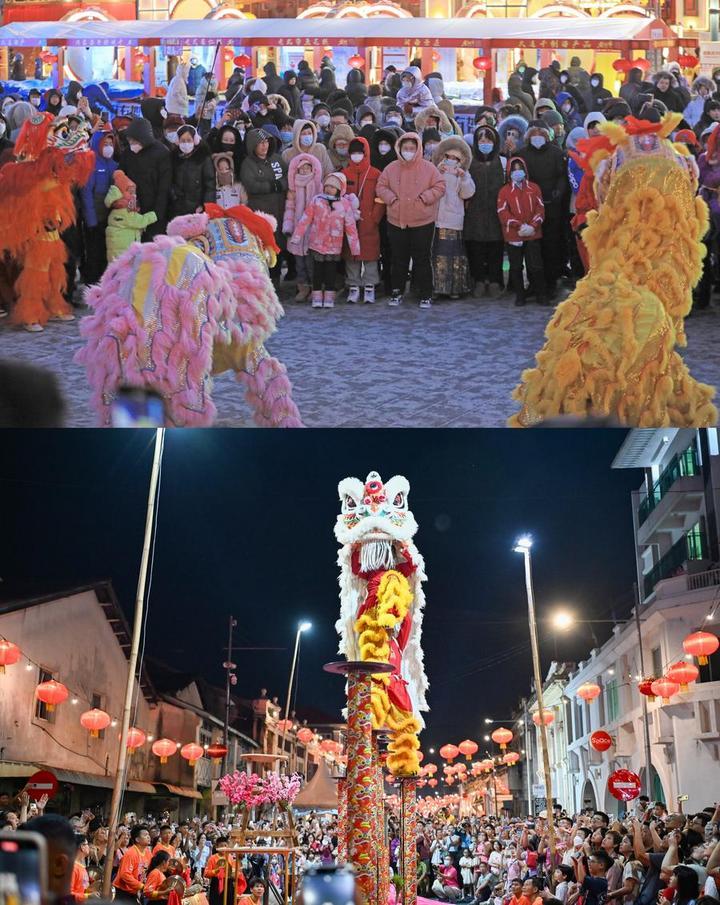 拼版照片:上圖為市民在沈陽新春皇寺廟會上觀看舞獅表演(2023年1月23日新華社記者楊青攝)。下圖為人們在馬來西亞檳城廟會上觀看舞獅表演(2025年2月1日新華社發(fā)李奕慧攝)。