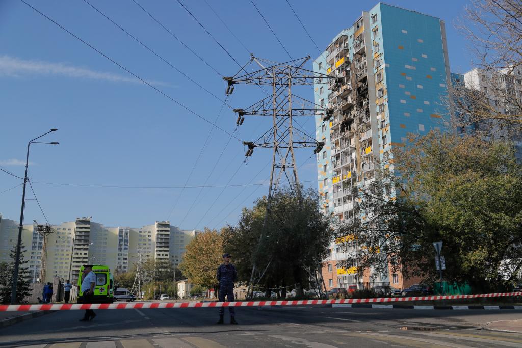 這是2024年9月10日在俄羅斯莫斯科州拉緬斯科耶拍攝的在無人機襲擊中受損的建筑。新華社發(fā)(亞歷山大攝)