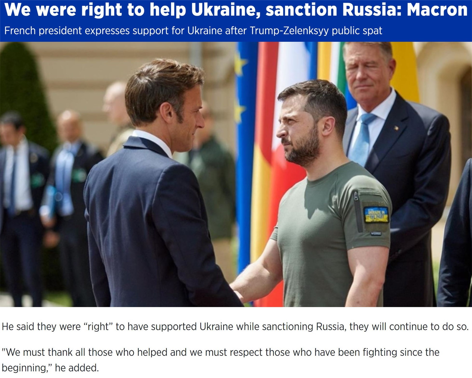 法國總統(tǒng)馬克龍?jiān)谂c澤連斯基通話后對媒體稱,西方支持烏克蘭是“正確”的,而且應(yīng)該繼續(xù)這樣做,因?yàn)椤澳切囊婚_始就在戰(zhàn)斗的人是在為歐洲的安全而戰(zhàn)”。
