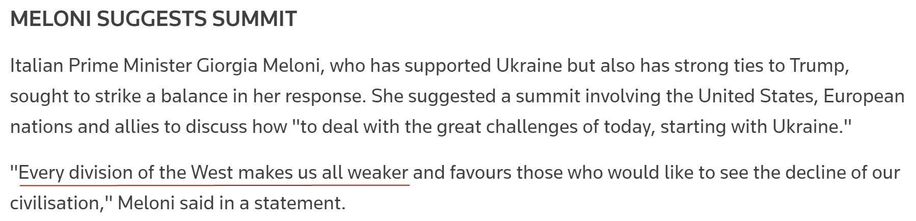 “西方的每一次分裂都使我們變得更加虛弱,并有利于那些希望看到我們文明衰落的人。分裂對誰都沒有好處。現(xiàn)在需要的是美國、歐洲國家和盟友之間立即舉行峰會,坦率地討論我們打算如何應(yīng)對今天的巨大挑戰(zhàn),從烏克蘭問題開始?!?/p>