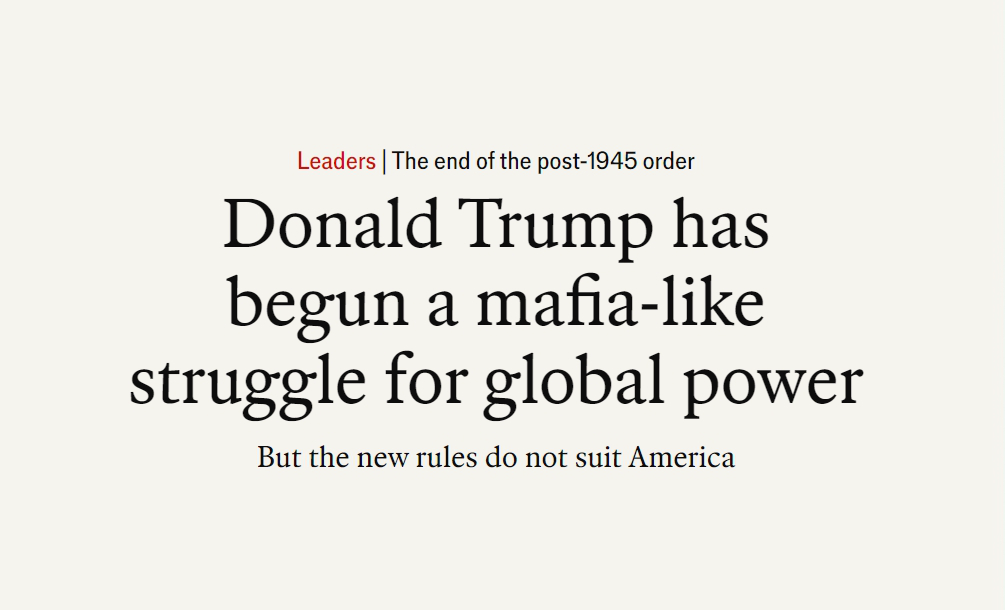 英國《經濟學人》網站近期刊文稱,美國總統(tǒng)特朗普已經開啟一場黑手黨式的全球權力爭奪。1945年后建立的世界秩序正在加速撕裂。一個強權即公理、小國受欺負的世界正快速到來。文章摘要如下: