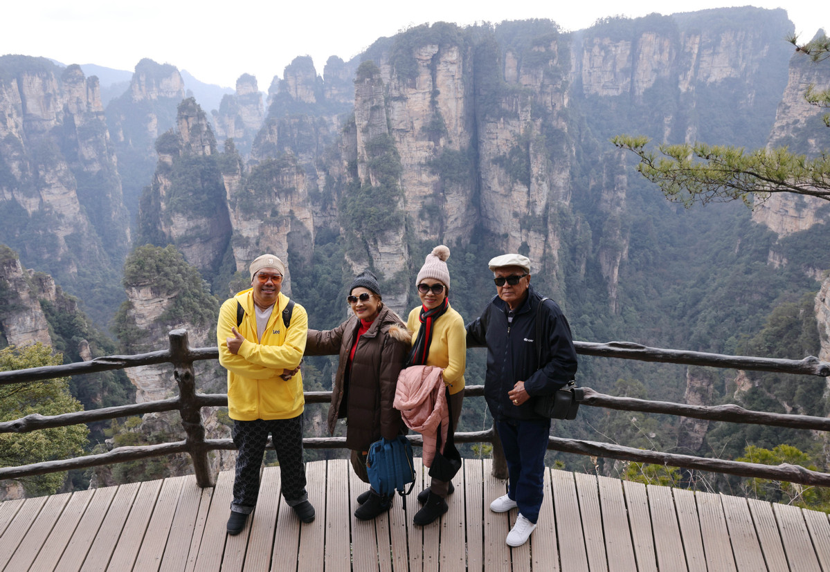 2月15日,泰國(guó)游客在張家界國(guó)家森林公園袁家界景區(qū)游玩。(圖片來源:新華社)