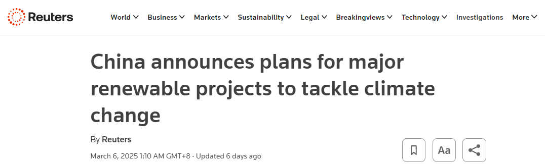 據(jù)路透社報道,中國政府5日宣布,將推出一系列重大可再生能源項目,力爭在2030年前實現(xiàn)二氧化碳排放峰值,并在2060年達(dá)成碳中和目標(biāo)。