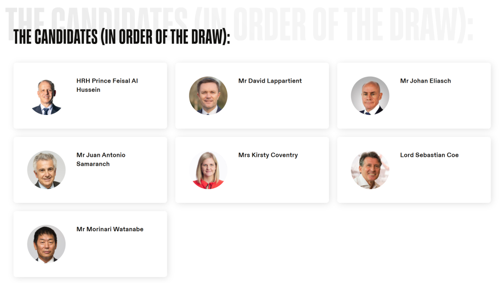 此次國際奧委會主席選舉共有創(chuàng)紀(jì)錄的七人參與,包括國際奧委會副主席小薩馬蘭奇,國際奧委會執(zhí)委、運(yùn)動員委員會前主席柯絲蒂·考文垂,世界田聯(lián)主席塞巴斯蒂安·科,國際自行車聯(lián)盟主席大衛(wèi)·拉帕爾蒂安,國際雪聯(lián)主席約翰·埃利亞施,國際奧委會執(zhí)委費(fèi)薩爾·侯賽因和國際體操聯(lián)合會主席渡邊守成。