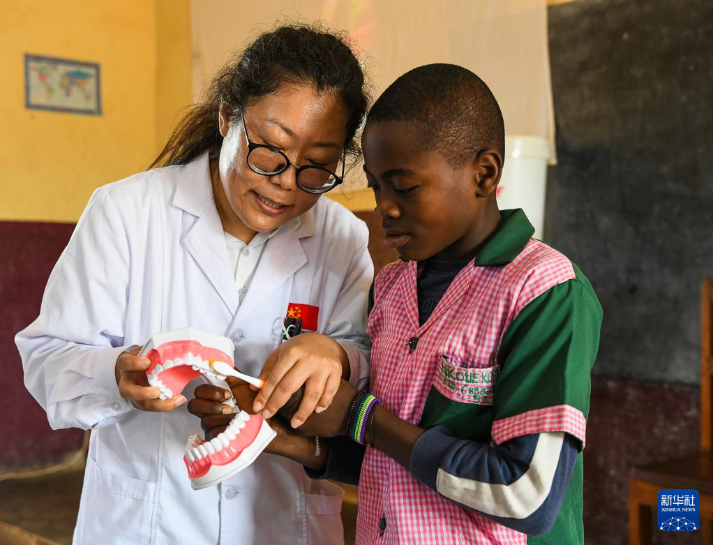 4月3日,在喀麥隆姆巴爾馬約的一所小學(xué),中國(guó)(山西)第24批援喀麥隆醫(yī)療隊(duì)姆巴爾馬約分隊(duì)的醫(yī)生為學(xué)生演示正確的刷牙技巧。新華社發(fā)(科普索攝)