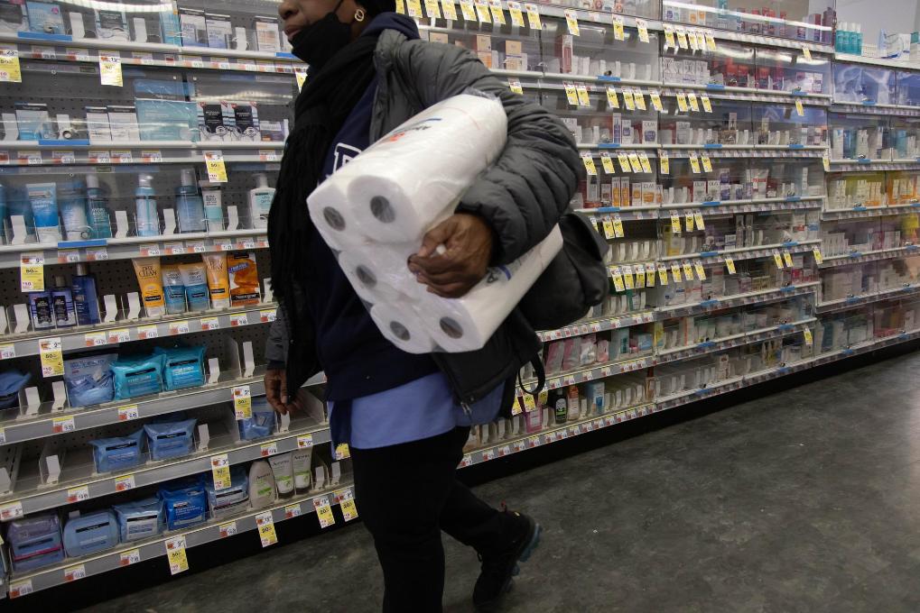 3月28日,顧客在美國(guó)紐約市一家藥房購(gòu)買(mǎi)衛(wèi)生紙。新華社發(fā)(郭克攝)