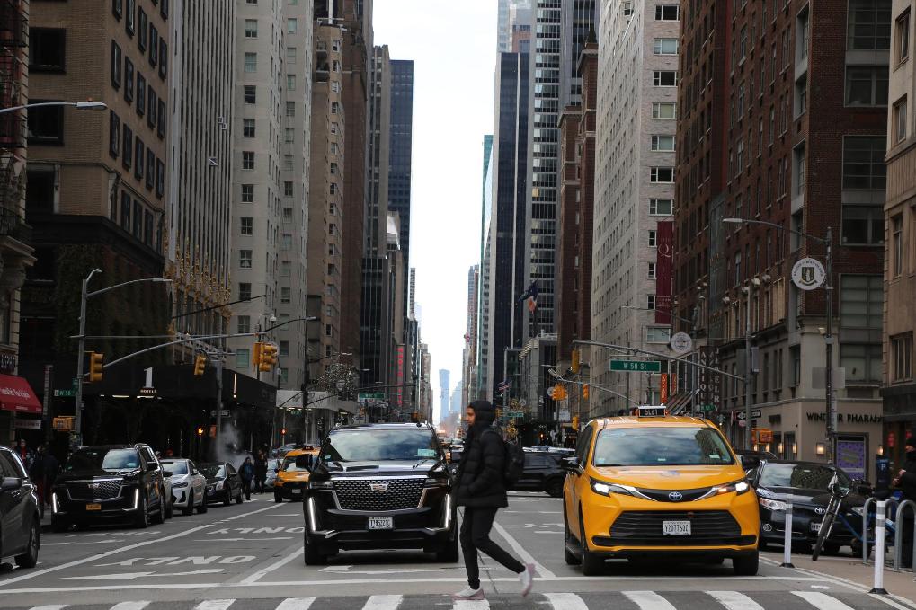 1月5日,在美國(guó)紐約曼哈頓,行人通過(guò)擁堵減緩區(qū)內(nèi)的一個(gè)人行橫道。新華社記者劉亞南攝