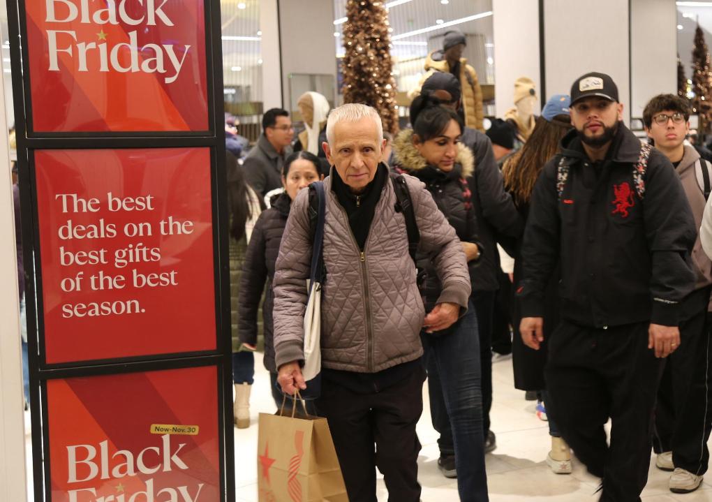 2024年11月29日,在美國(guó)紐約曼哈頓島的一家商場(chǎng)內(nèi),人們經(jīng)過(guò)“黑色星期五”促銷(xiāo)廣告牌。新華社記者劉亞南攝