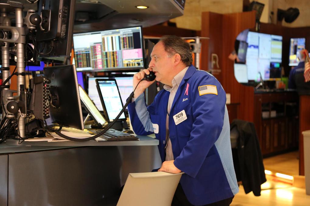 4月3日,交易員在美國(guó)紐約證券交易所交易大廳工作。新華社記者劉亞南攝