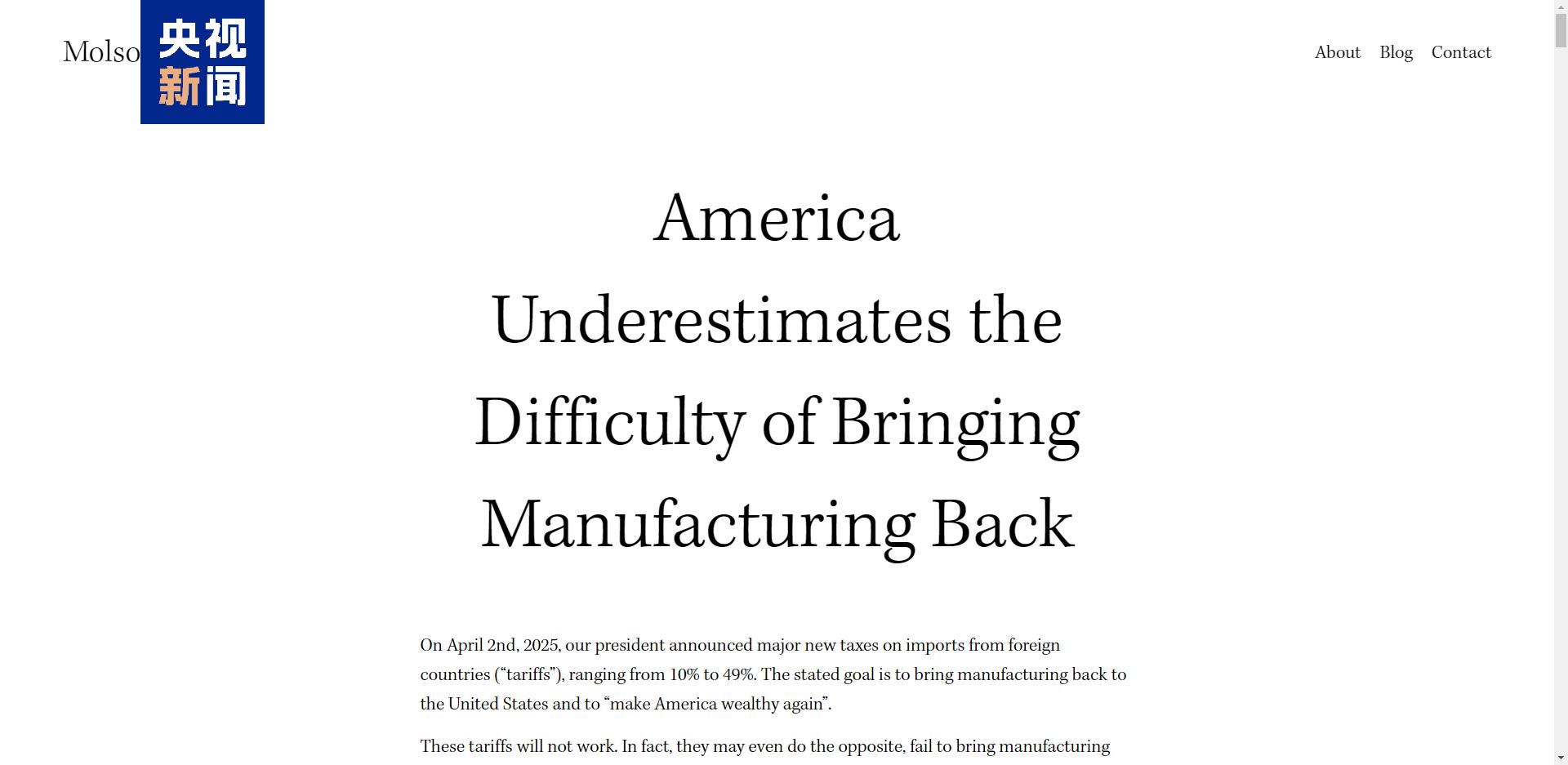 近日,美國(guó)一線企業(yè)主莫爾森·哈特結(jié)合自身經(jīng)驗(yàn),發(fā)布了題為《美國(guó)低估了制造業(yè)回流的難度》的文章,“控訴”特朗普的關(guān)稅政策,并用多個(gè)刀刀見血的論點(diǎn),揭穿了“關(guān)稅能救‘美國(guó)制造’”的致命幻覺。