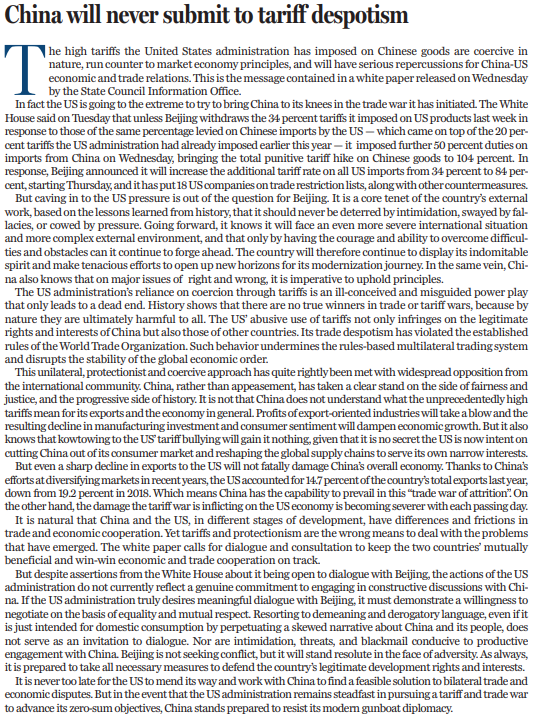 原標(biāo)題:China will never submit to tariff despotism
