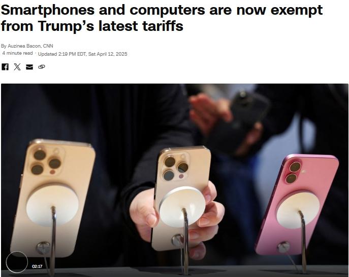 綜合報(bào)道,當(dāng)?shù)貢r(shí)間11日晚,美國(guó)海關(guān)與邊境保護(hù)局宣布,聯(lián)邦政府已同意對(duì)智能手機(jī)、電腦、芯片等電子產(chǎn)品免除所謂“對(duì)等關(guān)稅”。