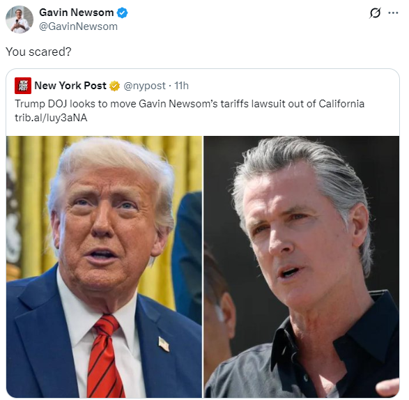 18日,美國加州州長加文·紐森在社交媒體上發(fā)聲,他轉(zhuǎn)發(fā)了一則《紐約郵報》的新聞消息。這則新聞標題為《特朗普的司法部似乎希望把紐森關稅訴訟的審理地挪出加州》。紐森在轉(zhuǎn)發(fā)消息時附加了一句評論:“你害怕了嗎?”