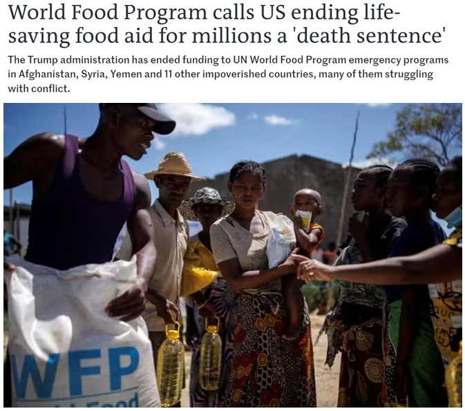 世界糧食計(jì)劃署警告說,美國中斷緊急糧食援助相當(dāng)于是對千百萬面臨極端饑餓的民眾“判處死刑”。