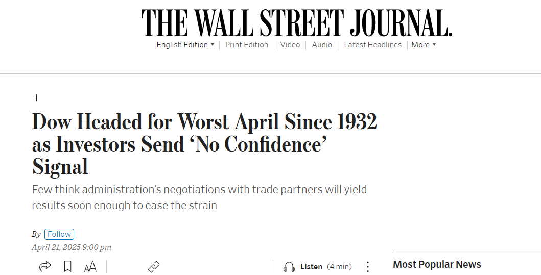 另據(jù)《華爾街日?qǐng)?bào)》4月21日?qǐng)?bào)道,道指或?qū)?chuàng)下近百年來最差4月表現(xiàn),投資者發(fā)出“不信任”信號(hào)。