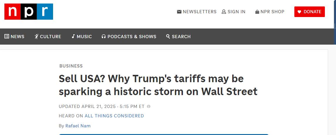 據(jù)美國(guó)國(guó)家公共廣播電臺(tái)(NPR)網(wǎng)站4月21日?qǐng)?bào)道,美國(guó)金融體系過去被視為全球最穩(wěn)定和強(qiáng)大的體系之一。然而,由于美國(guó)現(xiàn)任政府4月2日推出的所謂全球“對(duì)等關(guān)稅”政策,美國(guó)金融市場(chǎng)出現(xiàn)了前所未有的危機(jī):全球投資者可能因美國(guó)政策的不確定性而對(duì)美國(guó)失去信心。