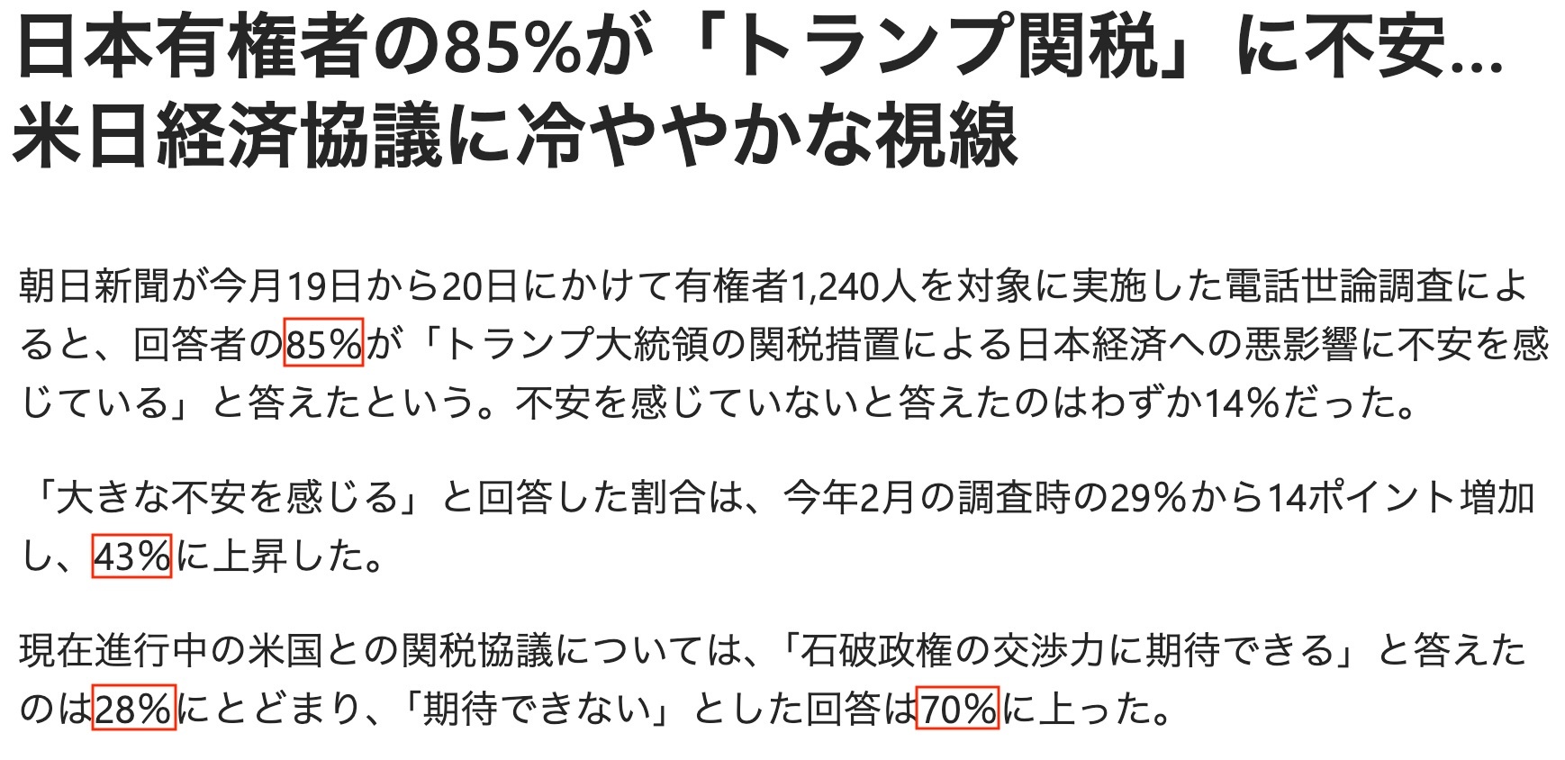 此外,多達(dá)70%的受訪者對日本政府與美國政府就關(guān)稅問題進(jìn)行的交涉不抱期待。