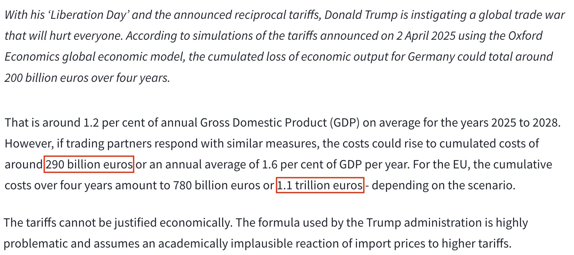 德國經(jīng)濟(jì)研究所日前發(fā)布的研究報(bào)告顯示,未來四年內(nèi),美國“對等關(guān)稅”措施可能令歐盟損失1.1萬億歐元,僅德國就將損失2900億歐元。