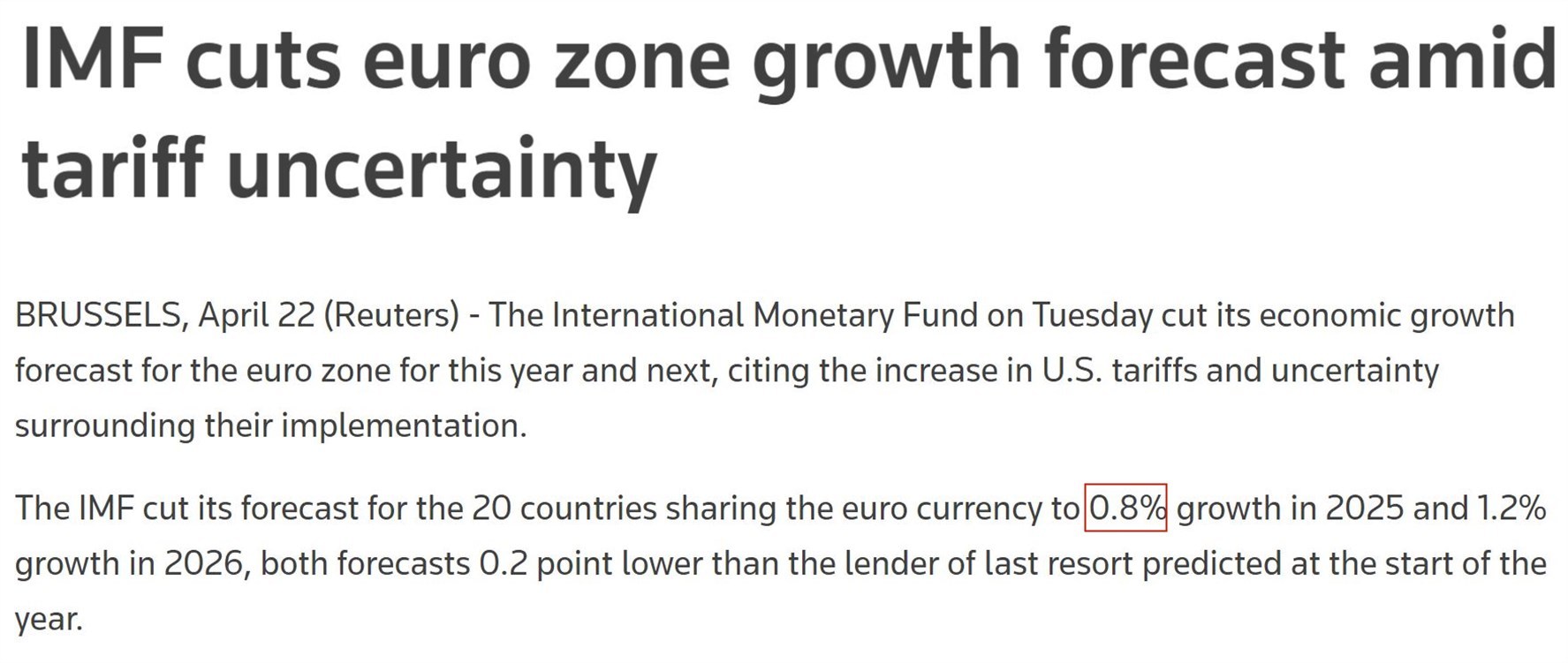根據(jù)國際貨幣基金組織22日發(fā)布的最新一期《世界經(jīng)濟(jì)展望報(bào)告》,受美國關(guān)稅措施沖擊和政策不確定性的影響,今年歐元區(qū)經(jīng)濟(jì)增長率預(yù)計(jì)將比之前下調(diào)0.2個百分點(diǎn)至0.8%。