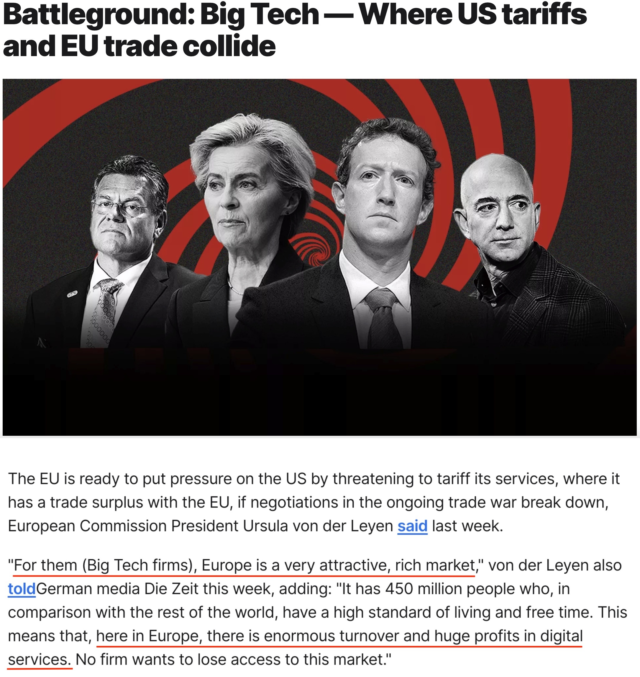 歐盟委員會主席馮德萊恩近日接受歐洲媒體采訪時(shí)表示,如果與美國的談判無法讓其取消對歐關(guān)稅,歐盟準(zhǔn)備動用“最有力的貿(mào)易措施”將大西洋兩岸的貿(mào)易戰(zhàn)擴(kuò)大到服務(wù)領(lǐng)域,包括對美國大型科技公司的數(shù)字廣告收入征稅、限制美國公司參與歐盟公共采購項(xiàng)目等。