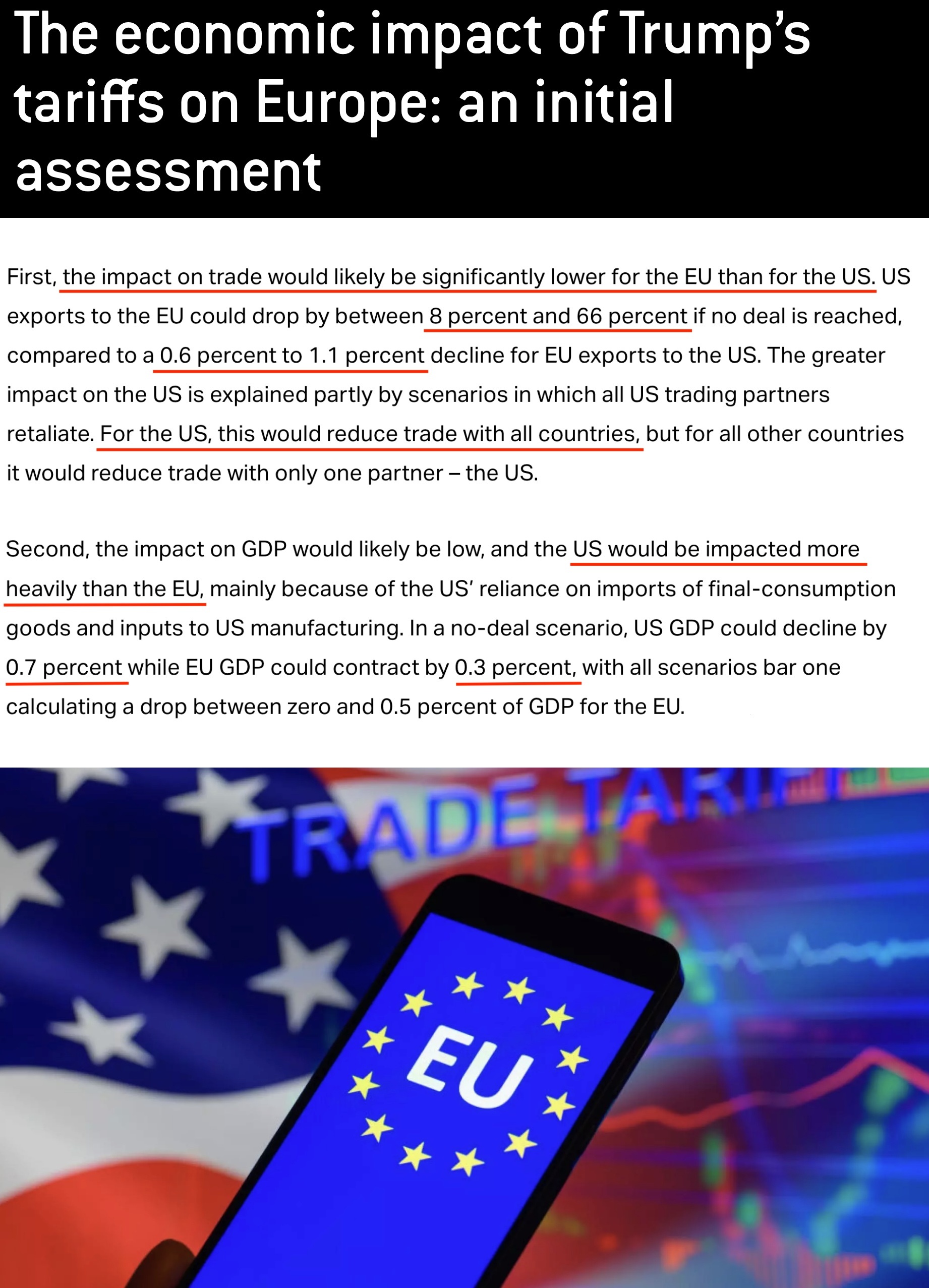 至于關(guān)稅對國內(nèi)生產(chǎn)總值(GDP)的影響,美國也將比歐盟更嚴(yán)重。如果不能與歐盟達(dá)成關(guān)稅協(xié)議,美國的GDP可能下降0.7%,而歐盟的GDP則可能僅下降0.3%。