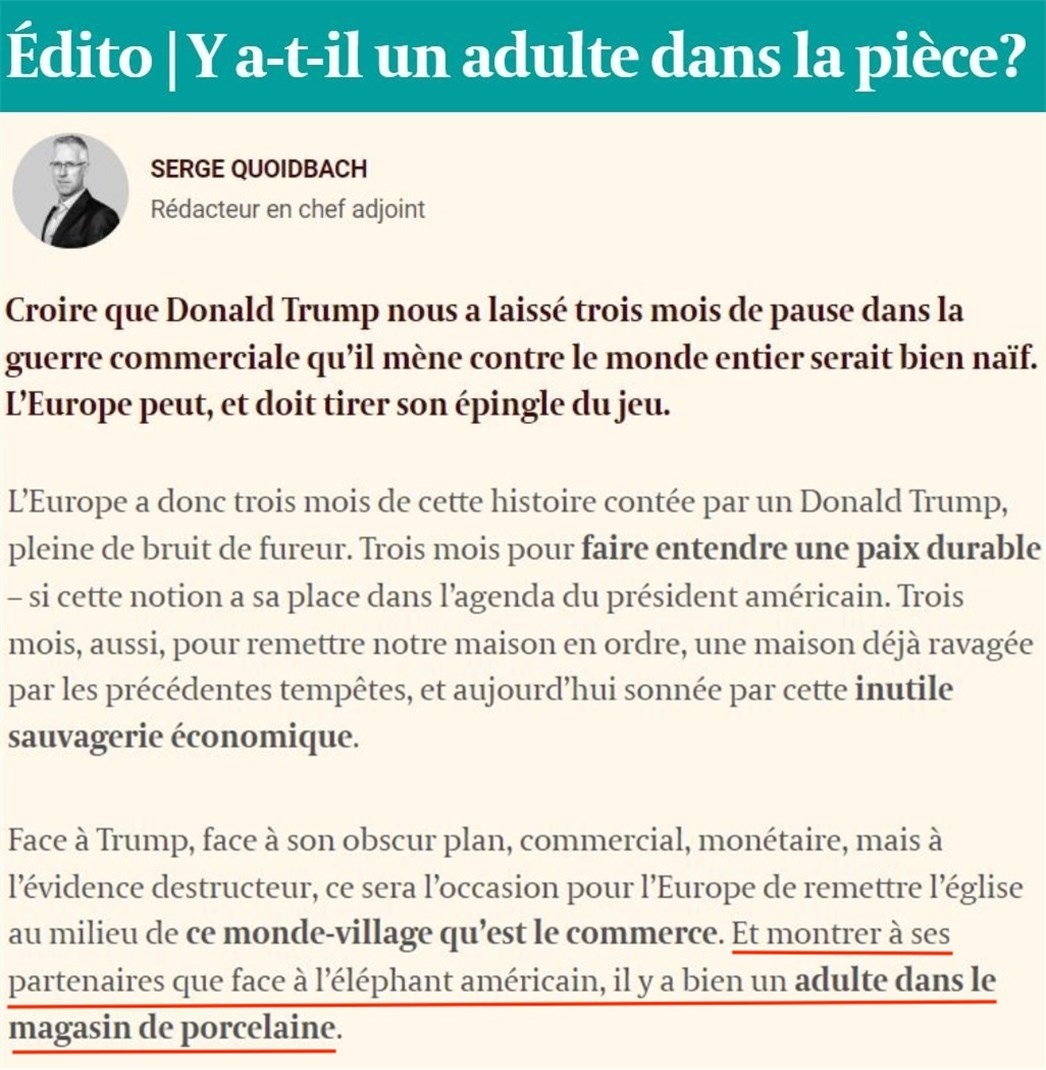 文章強(qiáng)調(diào),歐洲迫切需要推動重建貿(mào)易秩序,抓住機(jī)遇扭轉(zhuǎn)局勢,從而向合作伙伴證明,在美國這頭“大象”肆意妄為之際,瓷器店里仍有“成年人”坐鎮(zhèn)。