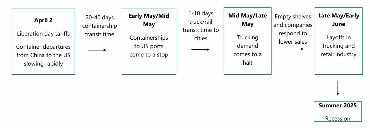 按其時間表所述,第一波次將在5月上旬至中旬發(fā)生。在經(jīng)歷三個階段后,在2025年夏季,美國經(jīng)濟陷入衰退,具體“四步走”的階段如下: