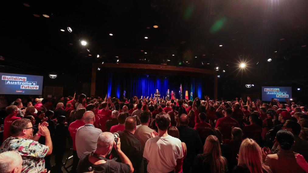 5月3日,在澳大利亞悉尼,工黨支持者在競(jìng)選集會(huì)上慶祝勝利。新華社記者馬平攝