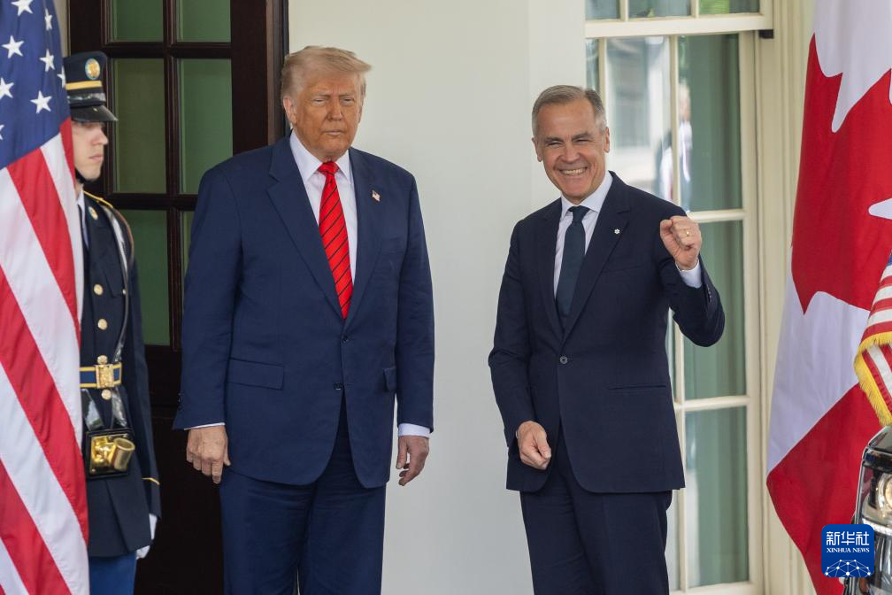 5月6日,美國總統(tǒng)特朗普(中)在華盛頓白宮迎接到訪的加拿大總理卡尼。新華社記者 胡友松 攝