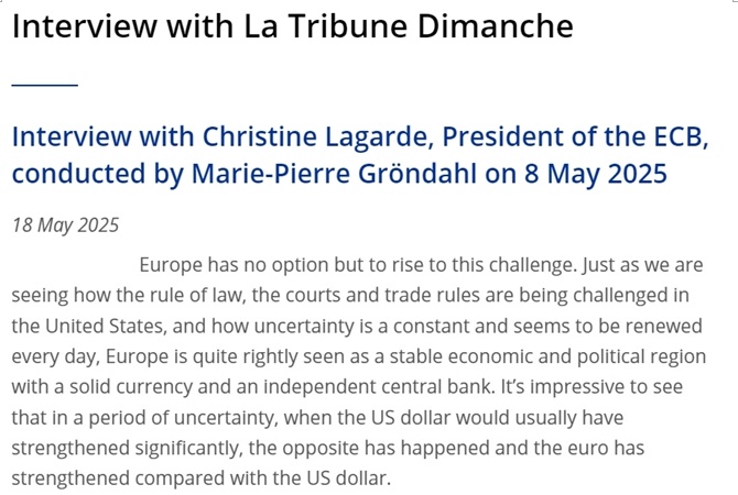 歐洲央行行長拉加德日前接受采訪時也表示,近期歐元對美元走強(qiáng)看似有悖直覺,其實源于金融市場對美國失去了信心。這是美國反復(fù)無常的關(guān)稅等政策造成的,“對歐洲來說是一個機(jī)遇”。