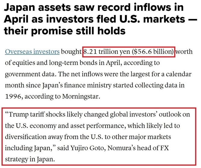 值得注意的是,在日本對美投資可能被“嚇退”的同時,“逃離”美國的資金正大量涌向日本。