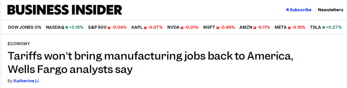富國銀行最新報告明確指出,美國的高額關稅政策難以實現(xiàn)制造業(yè)就業(yè)的持久反彈。
