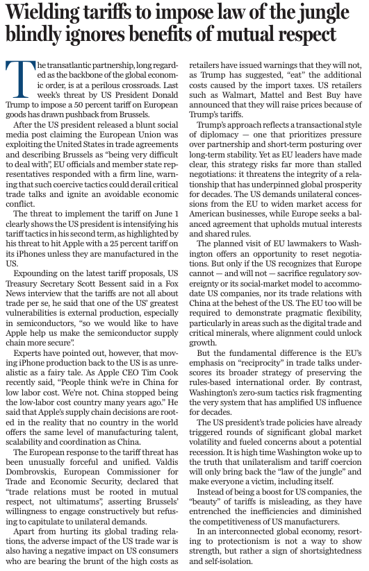 此次,歐盟對關(guān)稅威脅的回應(yīng)異常有力。歐盟貿(mào)易專員瓦爾迪斯·多姆布羅夫斯基斯明確表示:“貿(mào)易關(guān)系必須根植于相互尊重,而非強(qiáng)制與脅迫”。他同時強(qiáng)調(diào),歐委會愿意進(jìn)行建設(shè)性接觸,但絕不向單邊措施屈服。