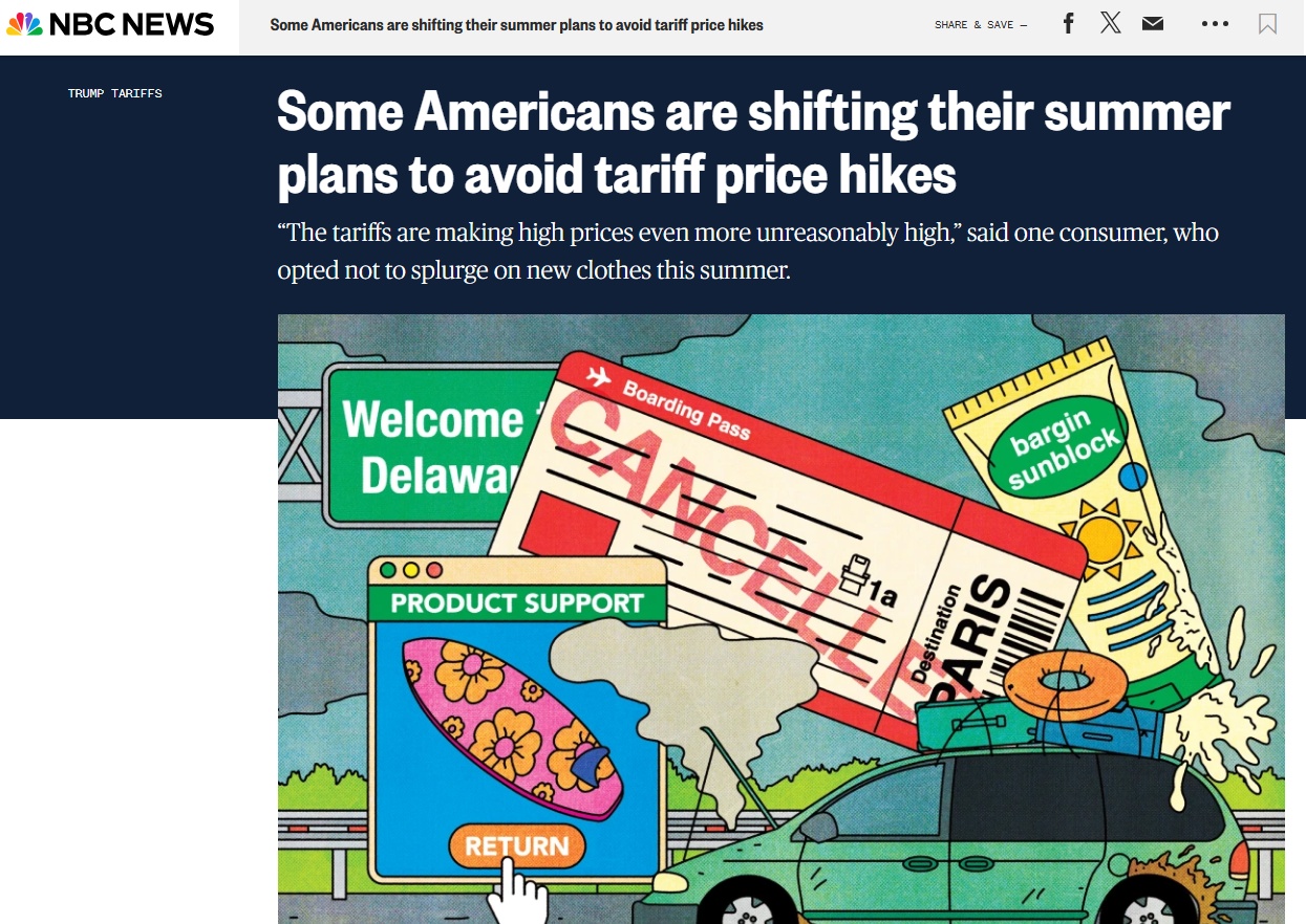 對于美國普通消費者而言,關(guān)稅也讓他們今年的夏天和往年有所不同。美國全國廣播公司網(wǎng)站近日的一篇文章說,美國政府的關(guān)稅政策,讓美國消費者對自身成本的擔(dān)憂持續(xù)加劇,他們不得不減少休閑活動和購物狂歡。