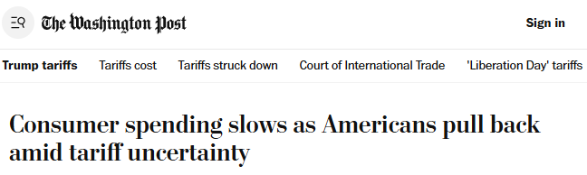 《華盛頓郵報》報道稱,由于美國政府的貿(mào)易戰(zhàn)持續(xù)引發(fā)經(jīng)濟不確定性,目睹關稅風波的美國人已開始縮減開支。新數(shù)據(jù)顯示,美國人購買汽車和服裝時愈發(fā)謹慎。美國經(jīng)濟分析局5月30日發(fā)布的數(shù)據(jù)顯示,本就顯疲軟的消費支出增長在4月顯著放緩,因為更多家庭在觀望關稅相關的不確定性將如何發(fā)展。