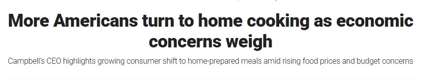 ??怂关斀?jīng)(Fox Business)的報道援引了罐頭食品生產(chǎn)商金寶湯(Campbell's)首席執(zhí)行官米克·比克胡伊森的話稱,隨著經(jīng)濟擔憂加劇,更多美國家庭選擇在家烹飪以節(jié)省開支。他近期在其公司第三季度財報電話會議上告訴分析師,整個季度消費者情緒持續(xù)疲軟,購物者在食品支出上變得更加謹慎。