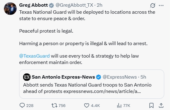 “和平抗議是合法行為,但傷害他人和損壞財(cái)產(chǎn)不合法,(肇事者)會(huì)被逮捕?!惫埠忘h籍的阿博特在社交媒體上說,“得州國(guó)民警衛(wèi)隊(duì)將用一切方式方法,幫助執(zhí)法機(jī)構(gòu)維持秩序?!?/p>