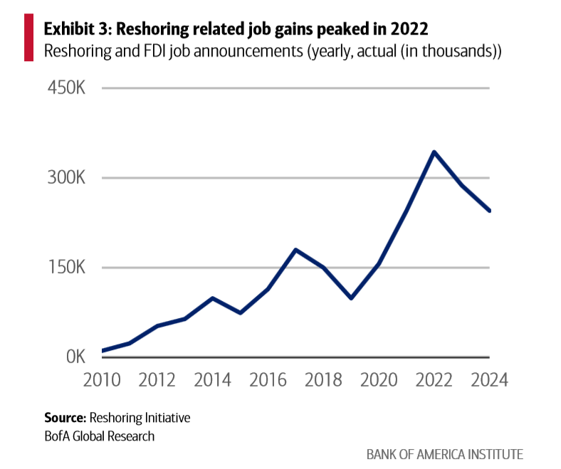 報(bào)告顯示,美國制造業(yè)回流創(chuàng)造的就業(yè)機(jī)會(huì)在2022年達(dá)到高峰后開始減少。
