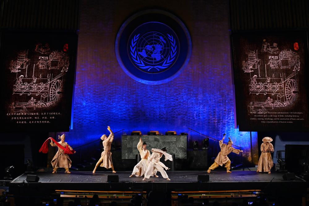 6月9日,在位于紐約的聯(lián)合國總部,演員在“跨越山海的文明對(duì)話”專場(chǎng)文藝演出上表演舞劇《天工開物》選段。新華社記者 李睿 攝