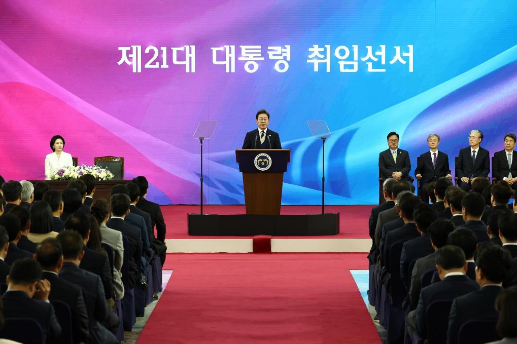 6月4日,在韓國(guó)首爾,李在明在韓國(guó)國(guó)會(huì)發(fā)表就職講話。新華社發(fā)